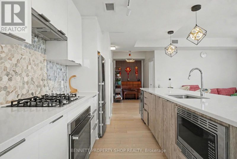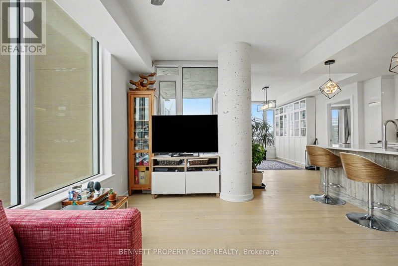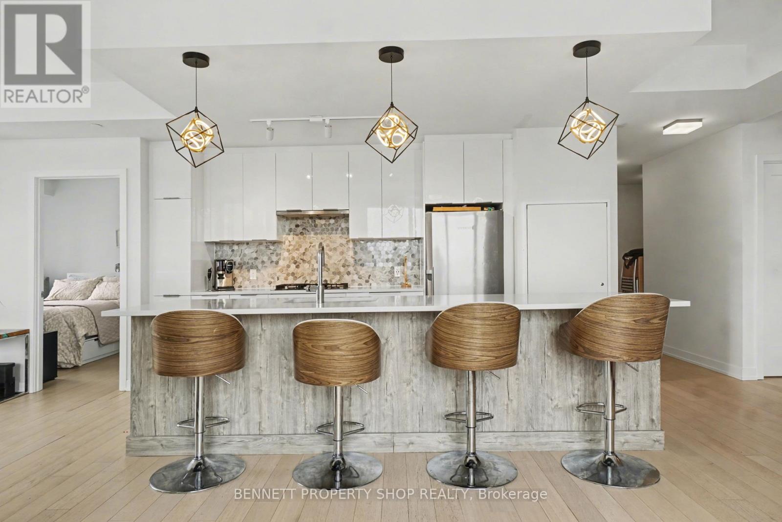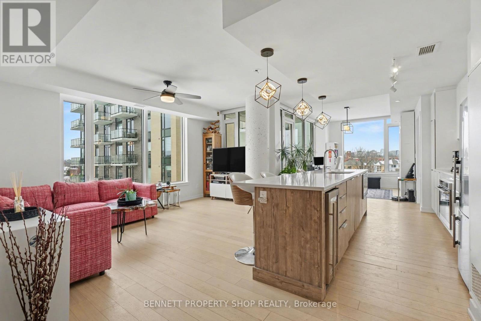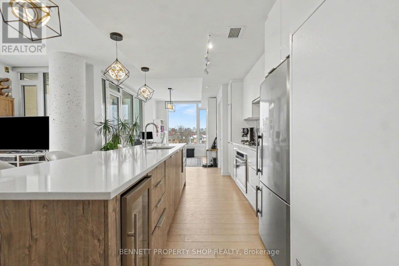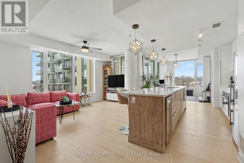 Welcome to The Terraces II by EQ Homes in Greystone Village, Old Ottawa East, one of Ottawa’s most desirable riverfront communities. Offering over 1,200 sqft, this is the largest suite currently available in the building, providing a rare combination of space, layout and upgrades that sets it apart from smaller 2-bedroom options.This upgraded corner suite features 2 bedrooms + den, 2 bathrooms and underground parking with EV charger. West-facing exposure fills the open-concept layout with natural light. Engineered hardwood flooring flows throughout the main living space, anchored by a chef-inspired kitchen with oversized quartz island, built-in wine fridge, sleek flat-panel cabinetry, stainless steel appliances, gas cooktop and built-in oven.The spacious living and dining areas open to a covered terrace with gas BBQ hookup. With over 1,200 sqft of interior living space, the scale of this layout is immediately noticeable and rarely available here.The primary retreat offers dual closets and a modern ensuite with walk-in glass shower. A generous second bedroom and versatile den provide flexibility for guests, work-from-home or hobby space.Additional features include motorized blinds, quartz bathroom counters, two bike racks and a storage locker. The parking space is directly across from the elevator doors, offering exceptional everyday convenience.Residents enjoy a fitness centre, party room, guest suite, library, bike and kayak storage, pet wash station and car/bike wash area. Ideally located between the Rideau River and Rideau Canal, steps to pathways, parks, Main Street shops and cafés, the Flora Footbridge, Lansdowne and downtown Ottawa. Luxury living in one of the city’s most walkable & desirable neighbourhoods.
