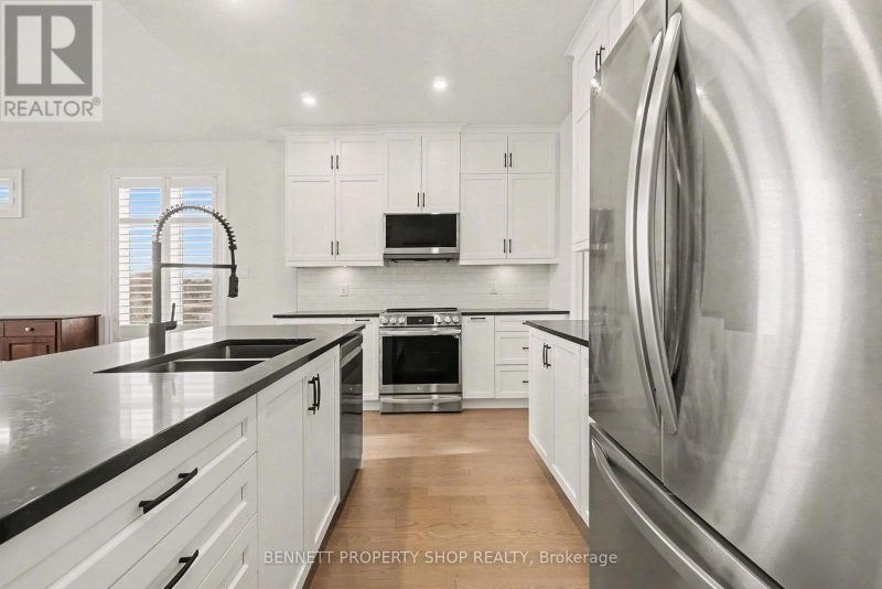 BETTER THAN NEW! Built in 2023, this stunning sun-filled Bungalow boasts extensive builder upgrades. The quality-built 3-bedroom, 2-bathroom Dumont Model by EQ homes is a functional smart home designed with a very rare walk-out basement featuring patio doors to an oversized, fully fenced yard. Backing onto nature with no rear neighbours, you will enjoy the warmth of the southern exposure & privacy with an oversized lot. Nestled on a cul-de-sac court, this architecturally attractive home has immediate curb appeal. Once inside, you will be immediately struck by the spacious open feel – vaulted ceilings, transom glass, & an abundance of natural light. Smart design features in this contemporary floor plan make life a breeze. Custom California shutters add a natural warmth & are complemented by expansive 9-foot ceilings. The flooring throughout is gorgeous – from the tiled entry to the 4″ wide plank hardwood, all in neutral tones. The crisp white Kitchen is a WOW!! If you love to entertain & enjoy a great kitchen, you will love this home. Cabinetry extends to the ceiling for maximum storage plus a walk-in pantry. Upgraded Stainless Appliances, Ceramic backsplash, Generous Island to seat 5, & even a Coffee Station custom designed to enhance your daily routine. The Vaulted ceiling invites your eye into the open family room with a cozy gas fireplace on a chilly evening. The Principle bedroom is a retreat from your day & has a spa bathroom with heated floors, a soaker tub & shower, & a walk-in closet. The generous 2nd bedroom also has a large walk-in closet. Separate 3 piece bathroom across the hall is very private & convenient. The 3rd room at the front of the home may be used as an office/den or a 3rd bedroom. Laundry room with upgraded cabinetry on the main level makes one-floor living a reality. You will fall in love with this home….and appreciate the value in all of the wonderful upgrades.